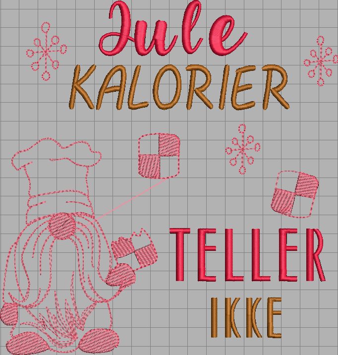 Julekalorier er et stitcheribroderi til en ramme på 20 x 20 cm. Filn inneholder flere filformater og må pakkes ut etter nedlasting for å kunne brukes. Filformater er JEF, VIP, PES, EXP, DST.